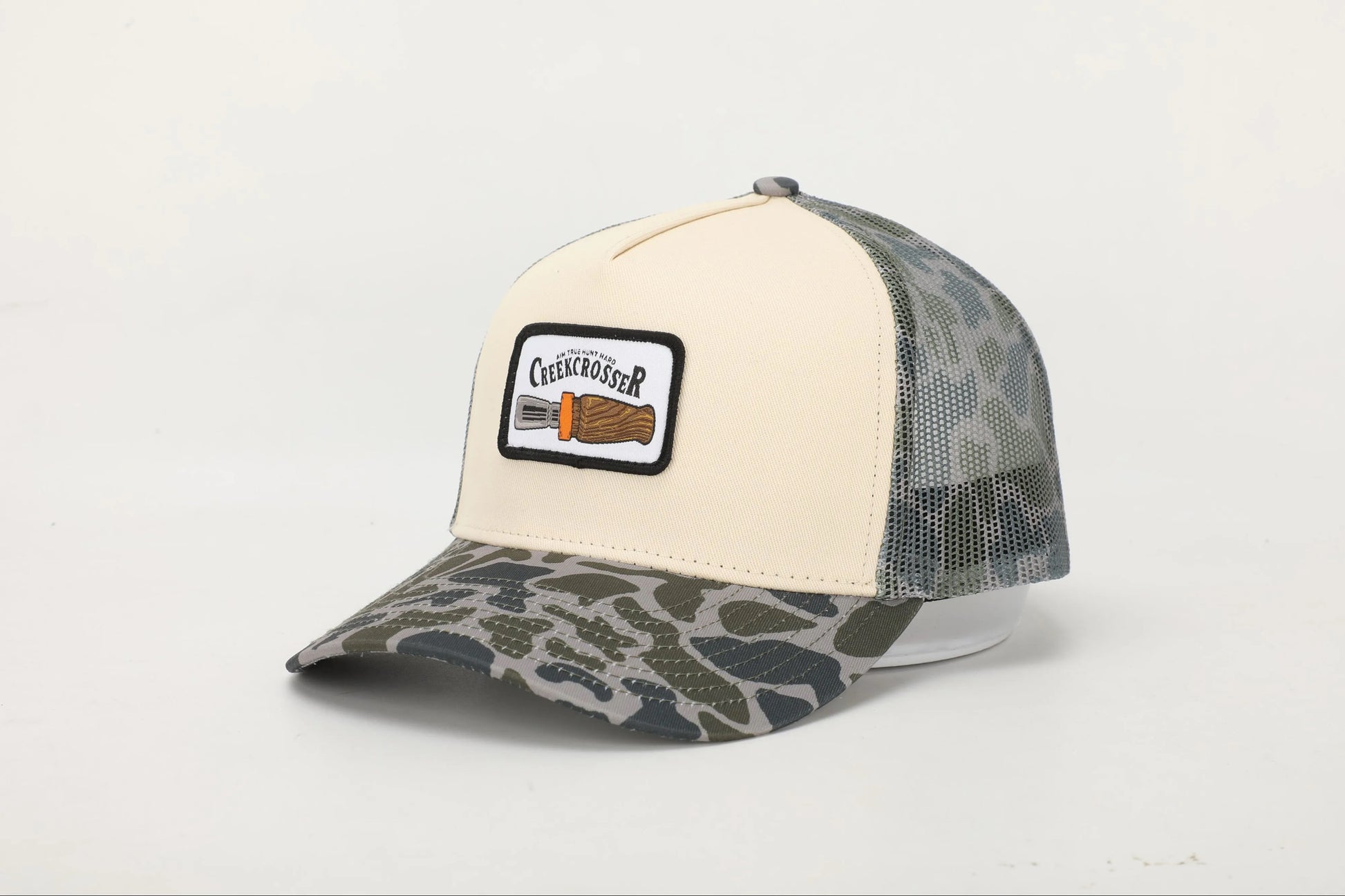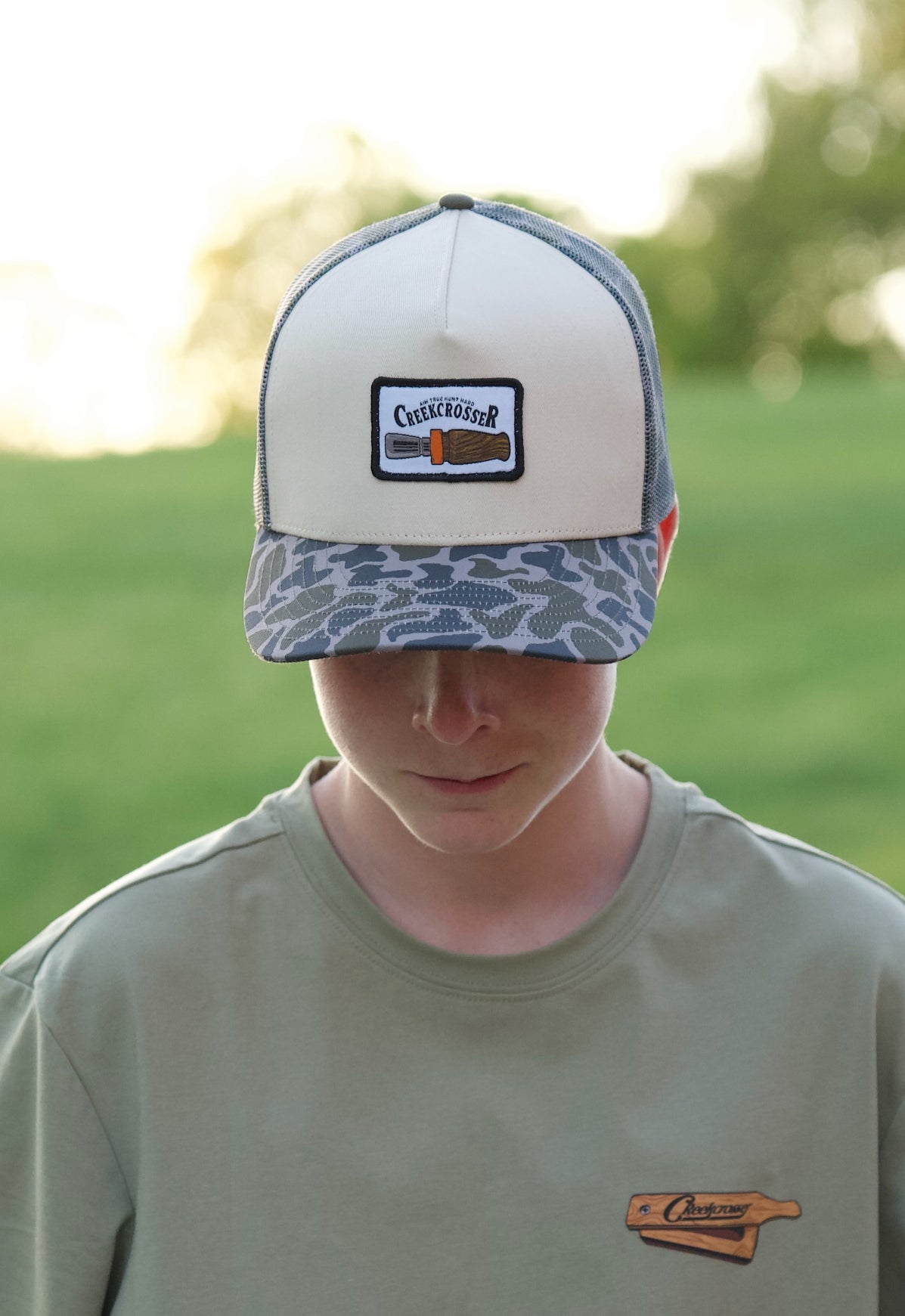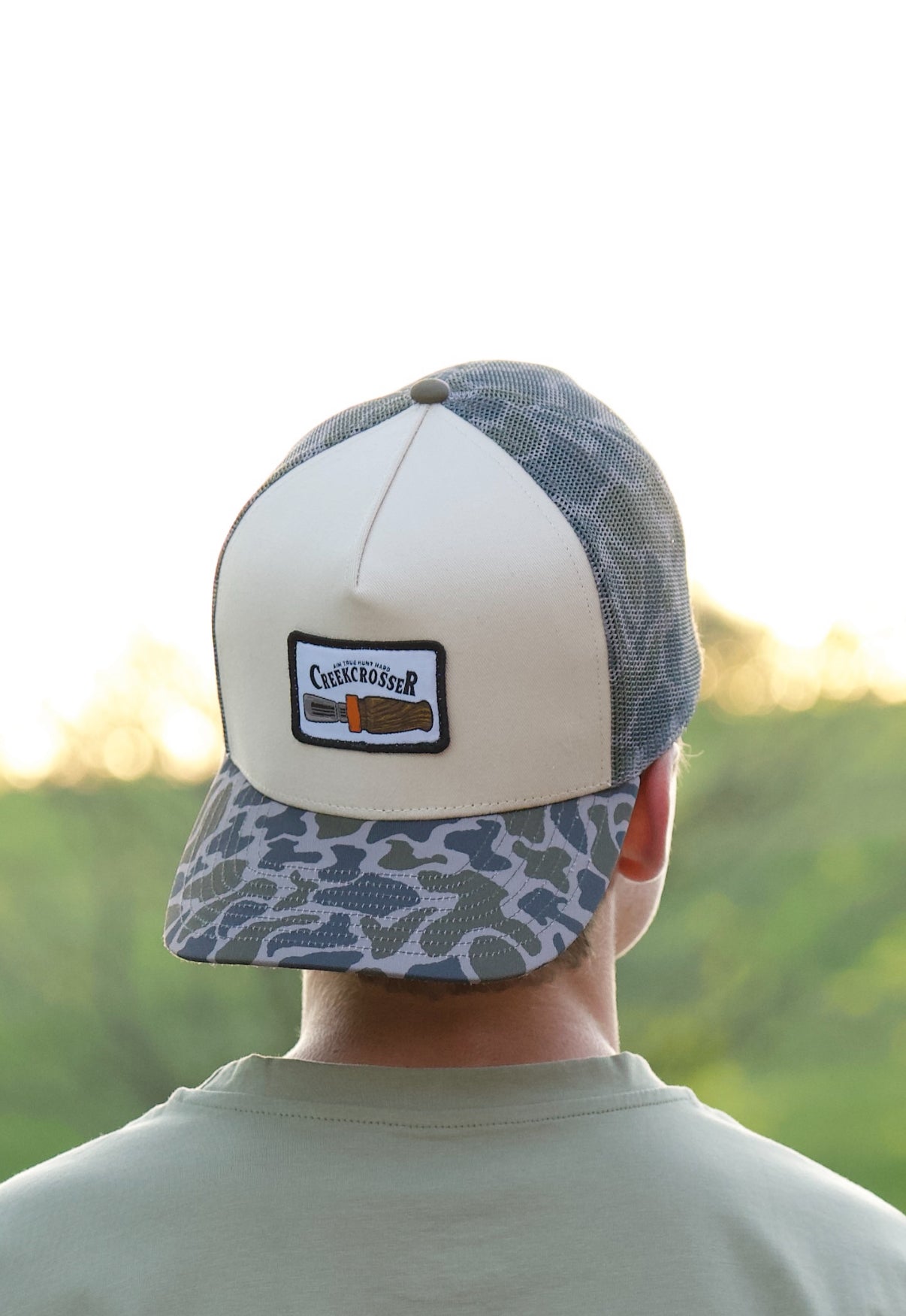 A throwback to the classics, the CreekCrosser Old School Hat delivers that true trucker style with a hunting twist. Featuring a bold duck call patch on the front and a camo bill, this cap pays tribute to mornings in the blind and the timeless sound of tradition. The mesh back keeps it breathable, while the snapback closure ensures a fit that’s just right.