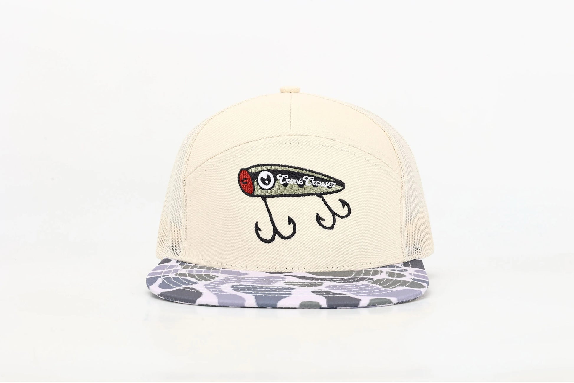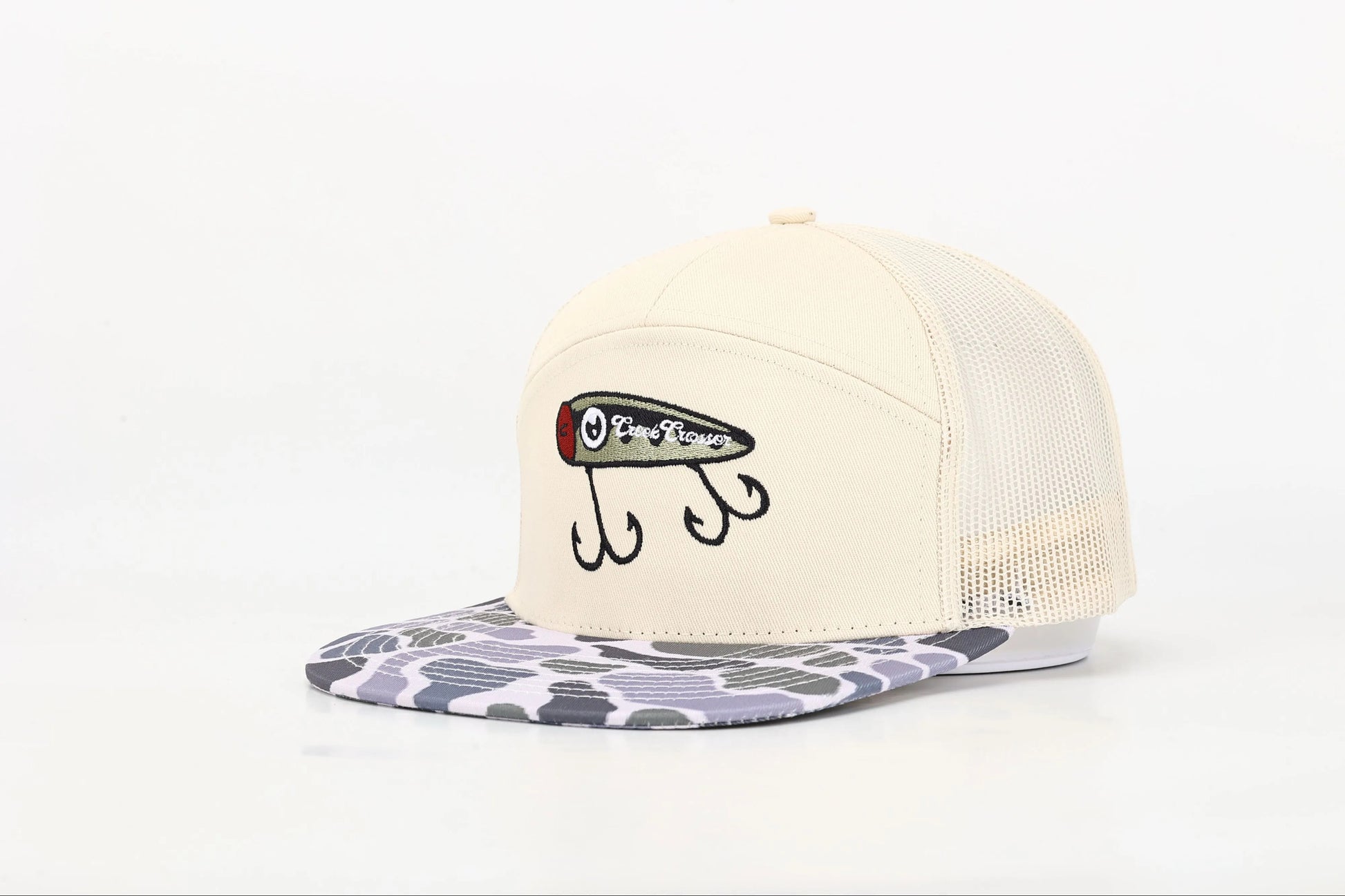 Make a splash with the CreekCrosser Top Water Hat. A 7-panel built for anglers and outdoorsmen who live for that strike on the surface. Featuring our embroidered topwater lure patch front and center, this cap is a nod to those glass-calm mornings and explosive blow-ups that every fisherman chases. The camo bill adds a rugged edge, while the mesh back keeps you cool from dawn to dusk.